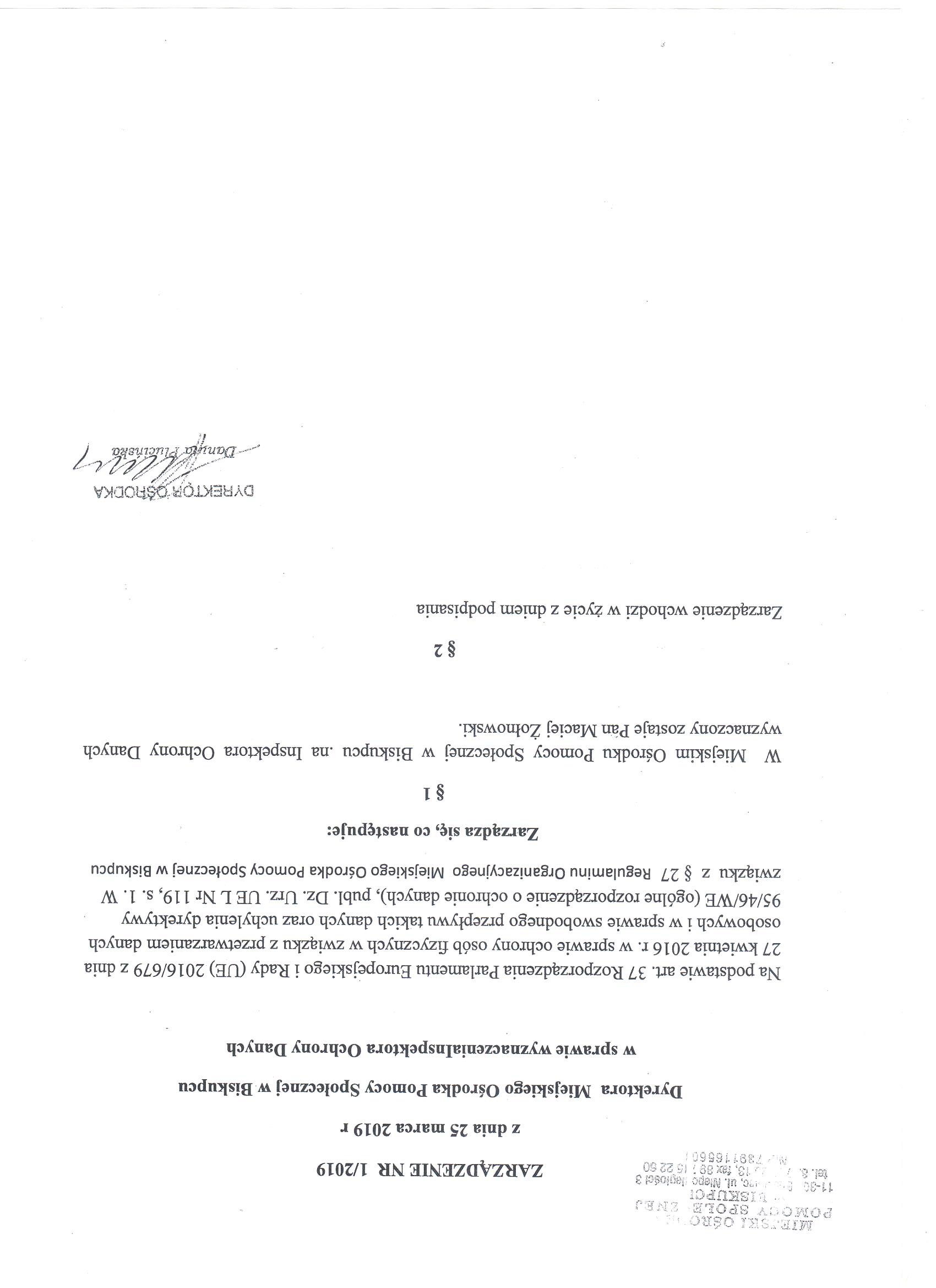 Zarządzenie Nr 1/2019 z dnia 25 marca 2019r. Dyrektora Miejskiego Ośrodka Pomocy Społecznej w Biskupcu