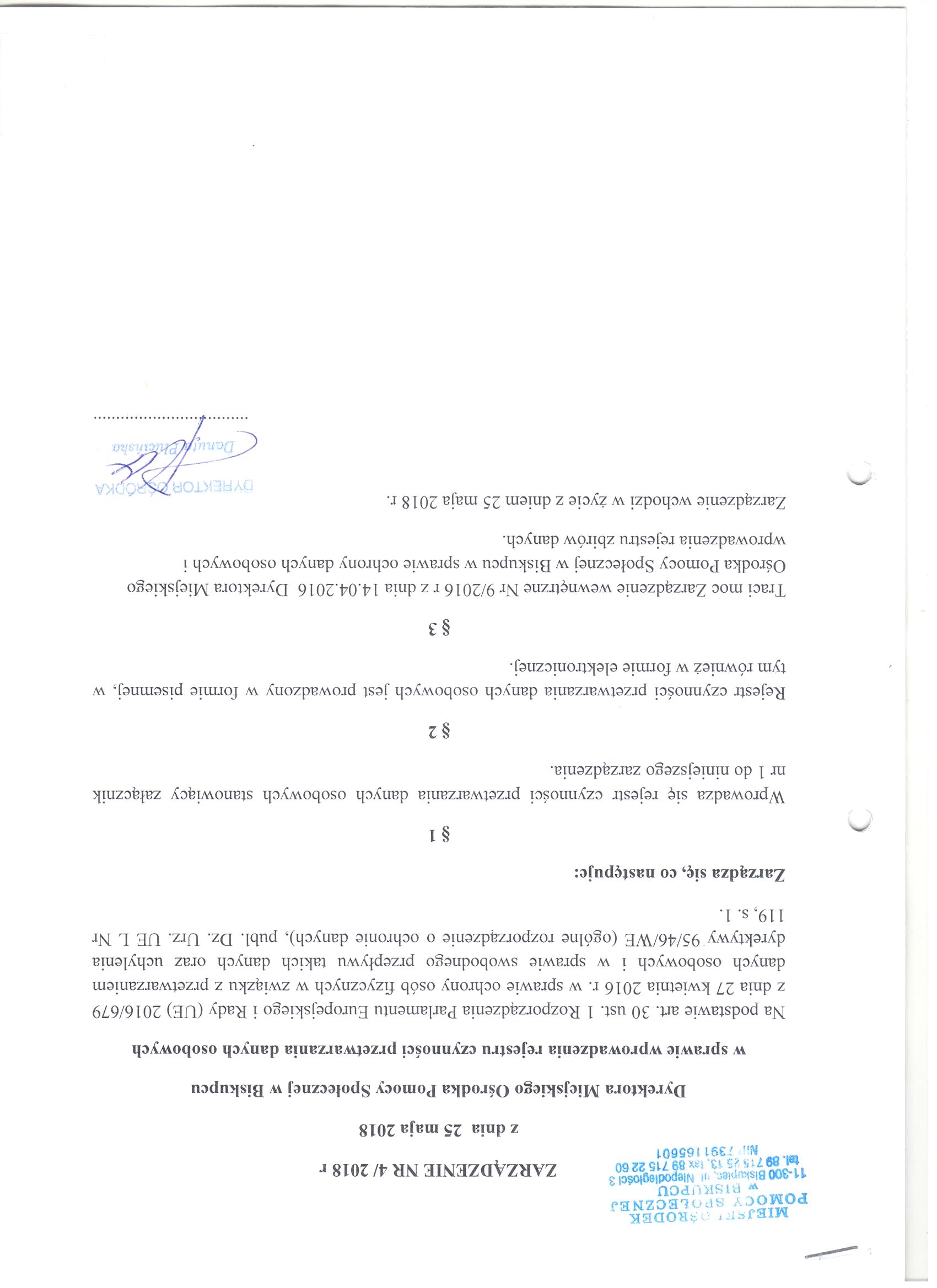 Zarządzenie Nr 4/2018 z dnia 25 maja 2018r. Dyrektora Miejskiego Ośrodka Pomocy Społecznej w Biskupcu