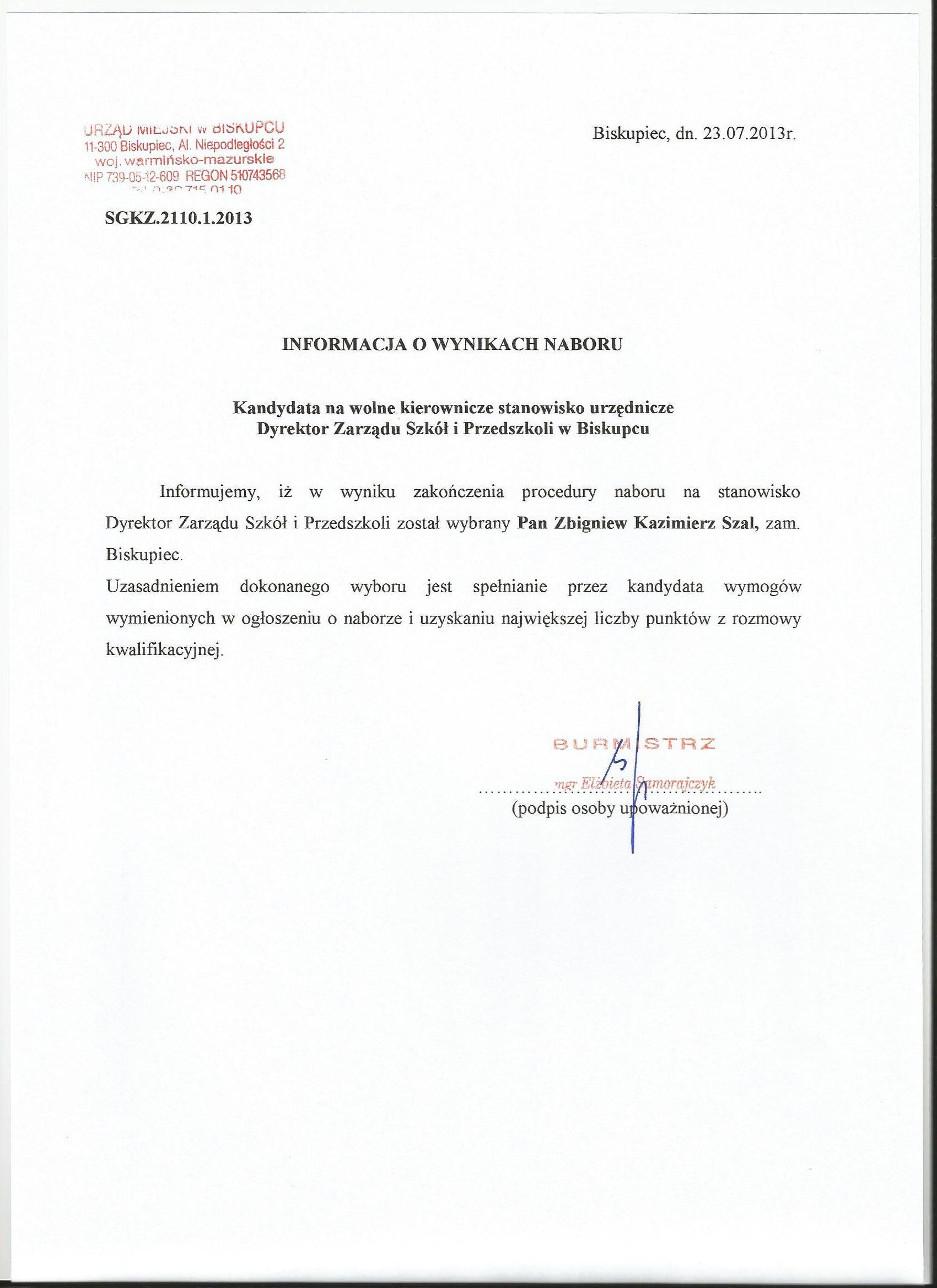 Burmistrz Biskupca ogłasza otwarty i konkurencyjny nabór na wolne kierownicze stanowisko urzędnicze w Zarządzie Szkół i Przedszkoli w Biskupcu.