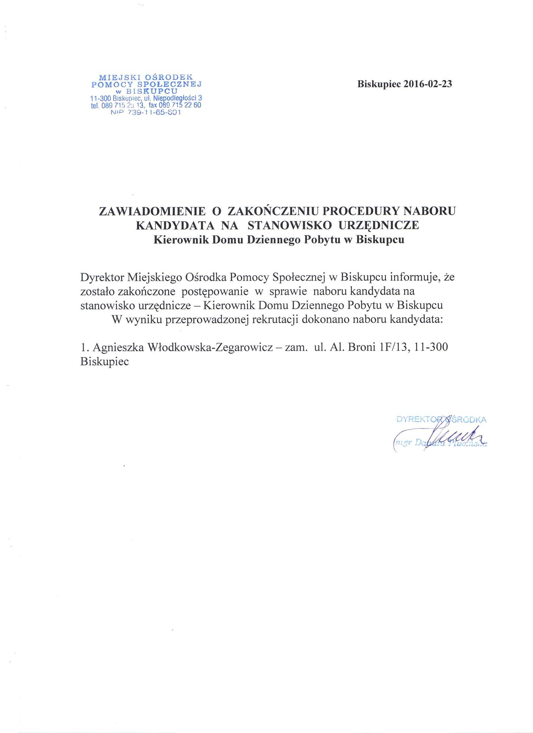 Wyniki I etapu konkursu na stanowisko: Kierownik Domu Dziennego Pobytu w Biskupcu.