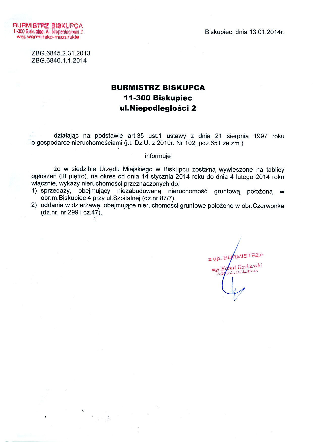 Informacja o wywieszeniu na tablicach ogłoszeń wykazy nieruchomości przeznaczonych do sprzedaży i dooddania w dzierżawę