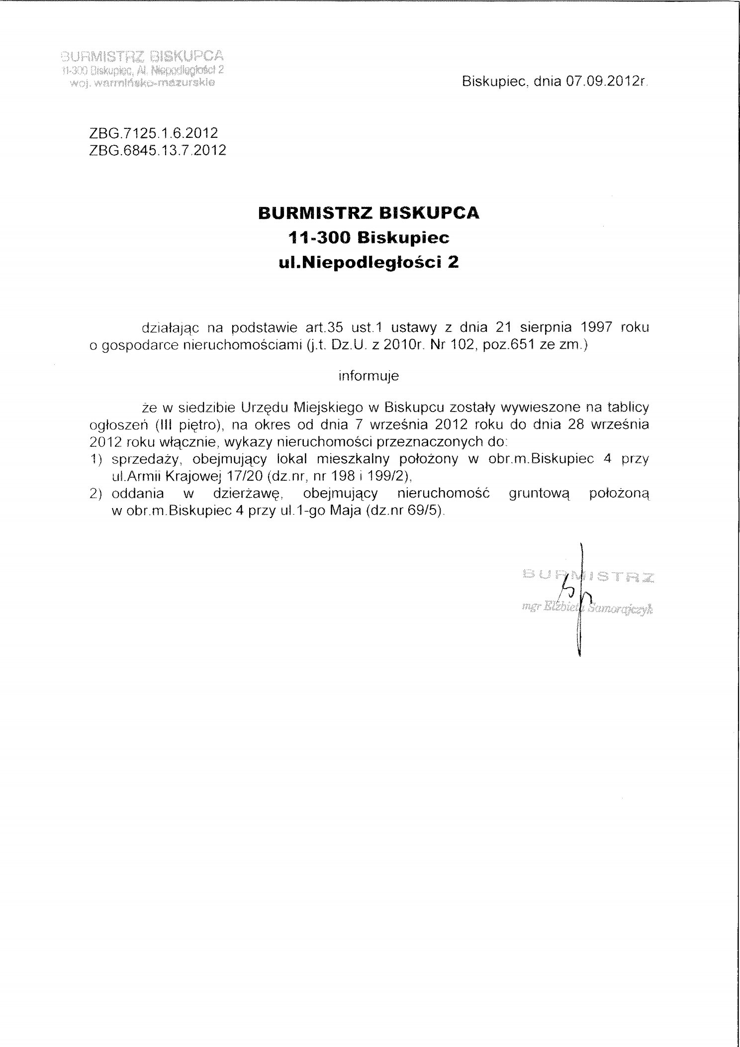 Obwieszczenie Burmistrza Biskupca z dnia 07 września 2012r. o wywieszeniu wykazów nieruchomości przeznaczonych do sprzedaży i oddania w dzierżawę.
