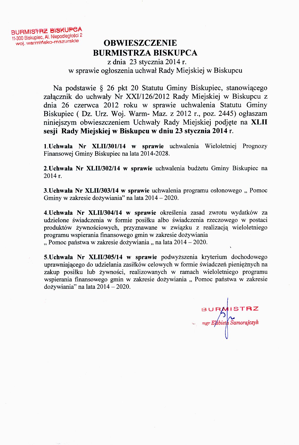 Obwieszczenie Burmistrza Biskupca z dnia 23 stycznia 2014r. w sprawie ogłoszenia uchwał Rady Miejskiej.
