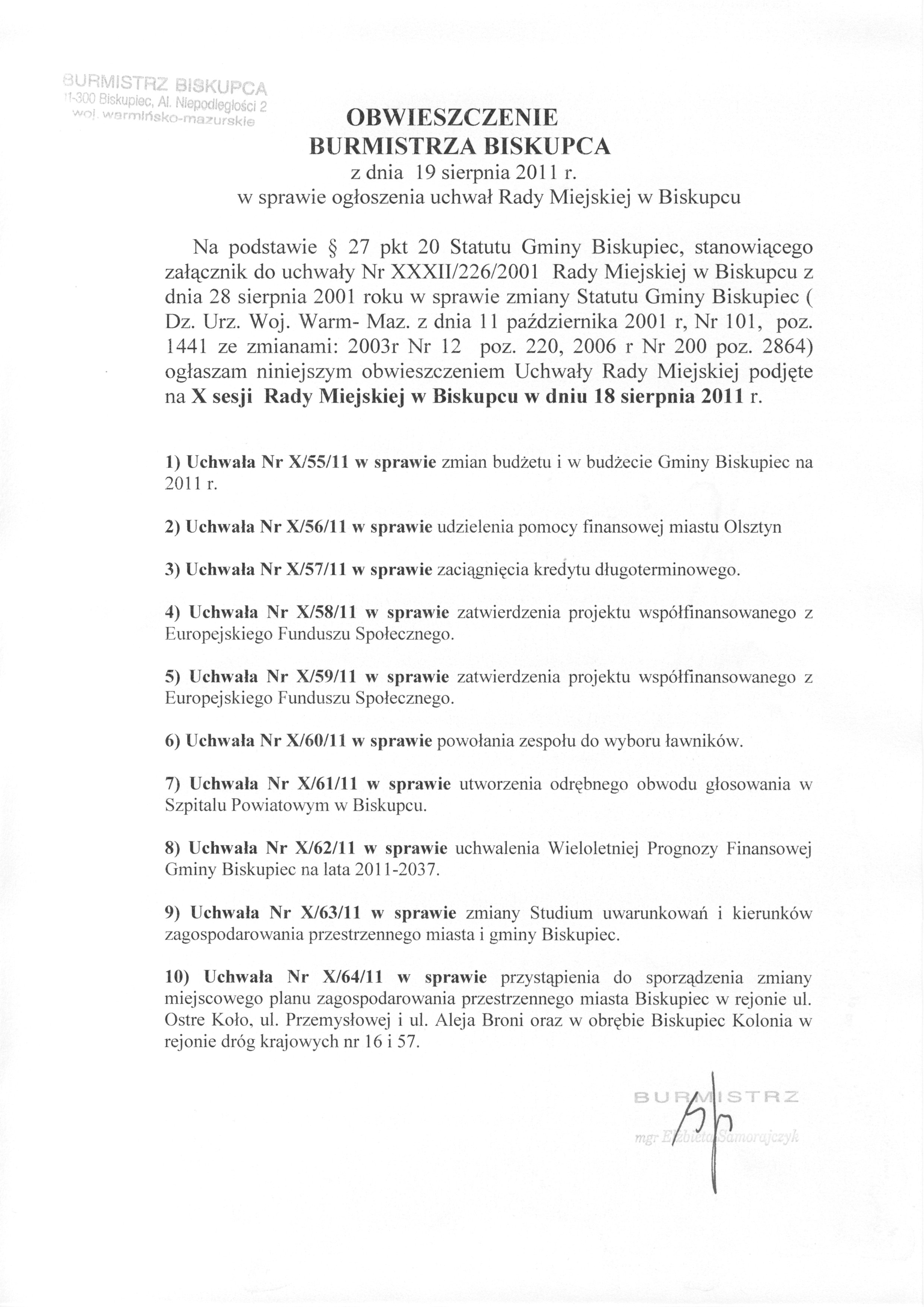 Obwieszczenie Burmistrza z dnia 19 sierpnia 2011r. w sprawie ogłoszenia uchwał Rady Miejskiej w Biskupcu.