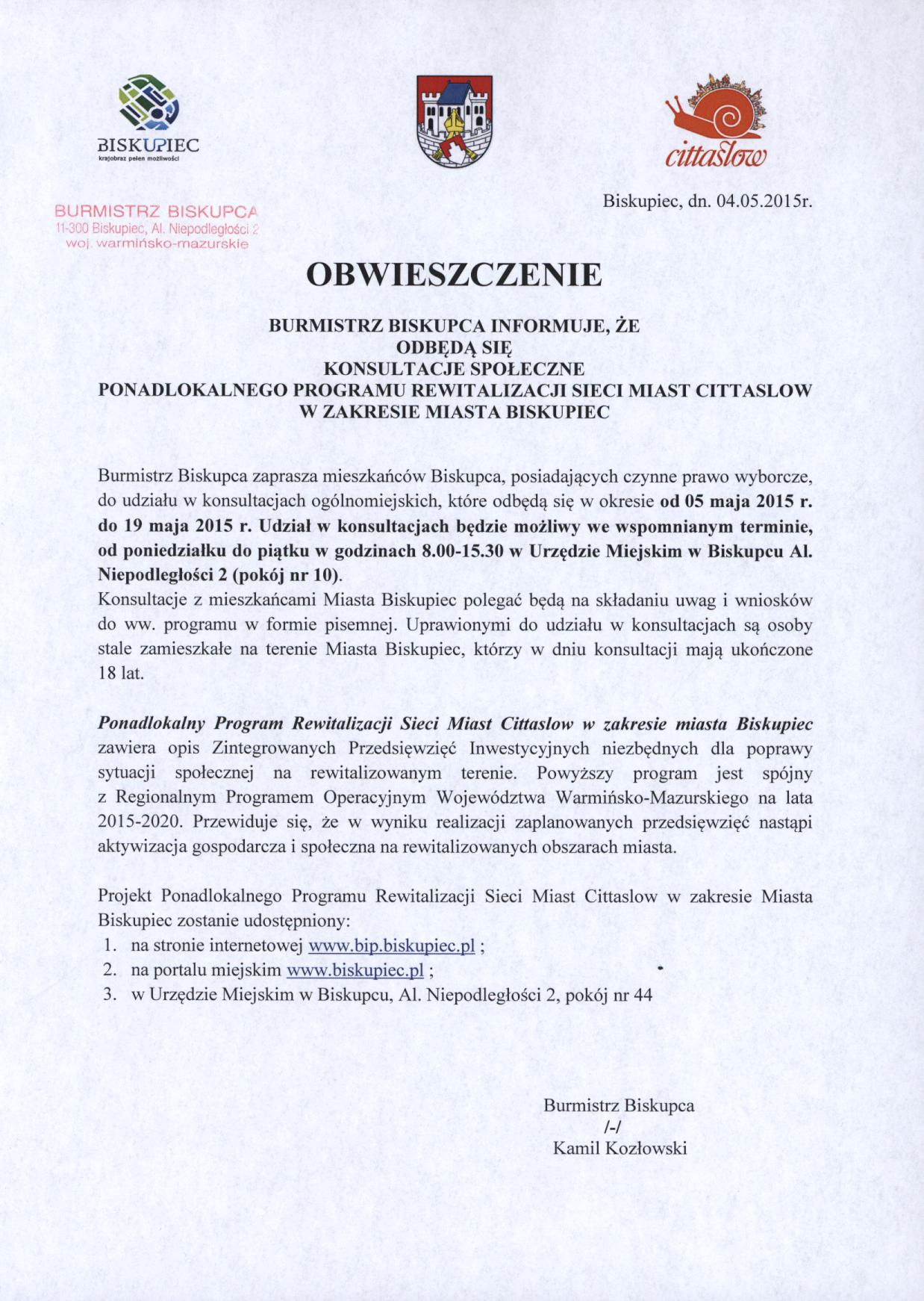 Burmistrz Biskupca informuje, że odbędą się konsultacje społeczne ponadlokalnego programu rewitalizacji sieci miast CITTASLOW w zakresie Miasta Biskupiec.