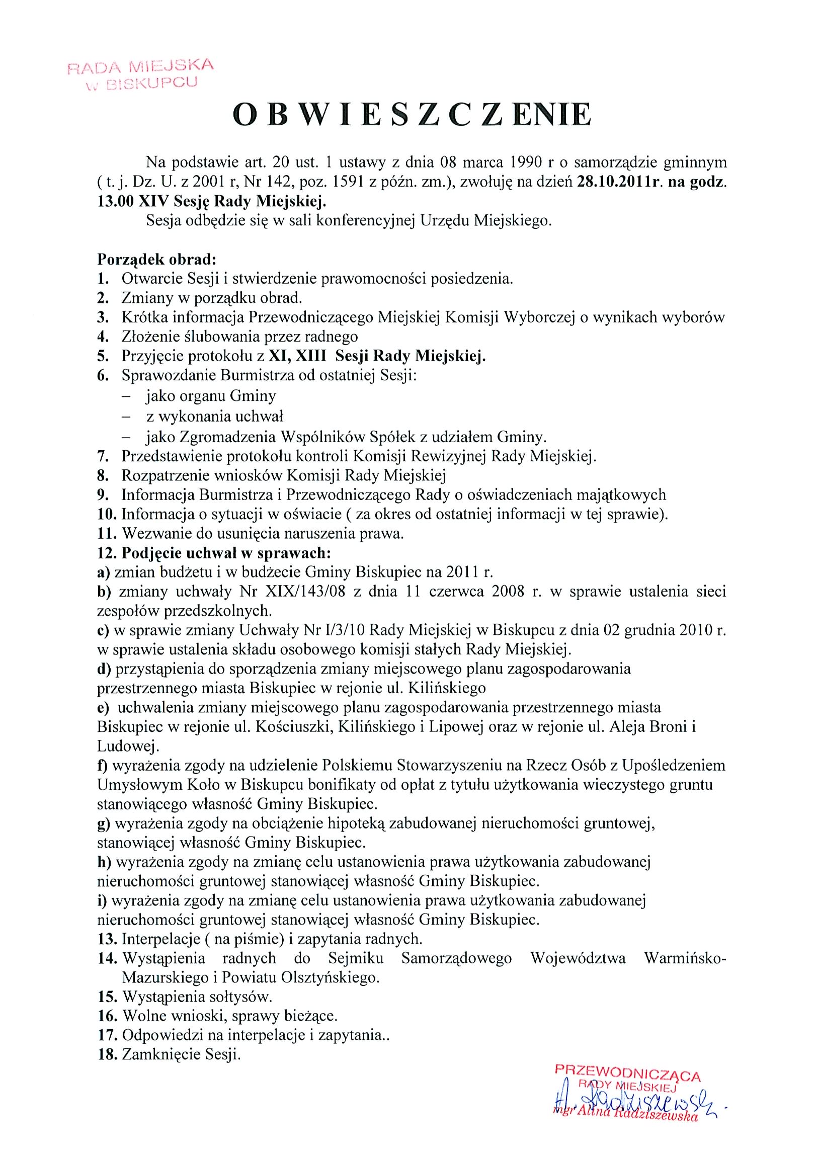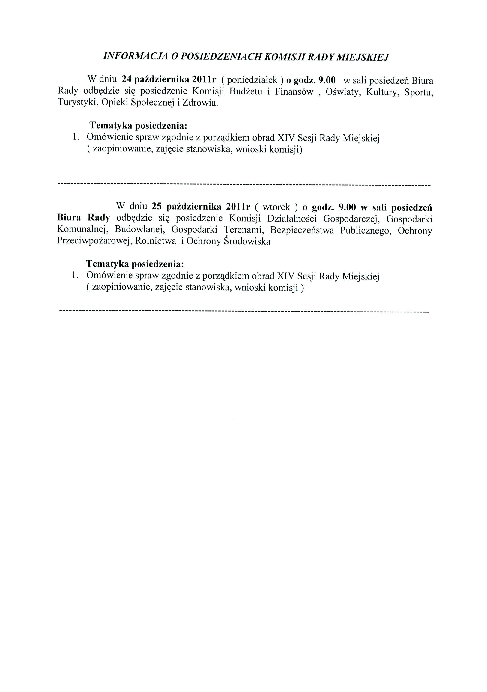 Obwieszczenie o zwołaniu sesji na dzień 28.10.2011 oraz Informacja o posiedzeniach komisji Rady Miejskiej