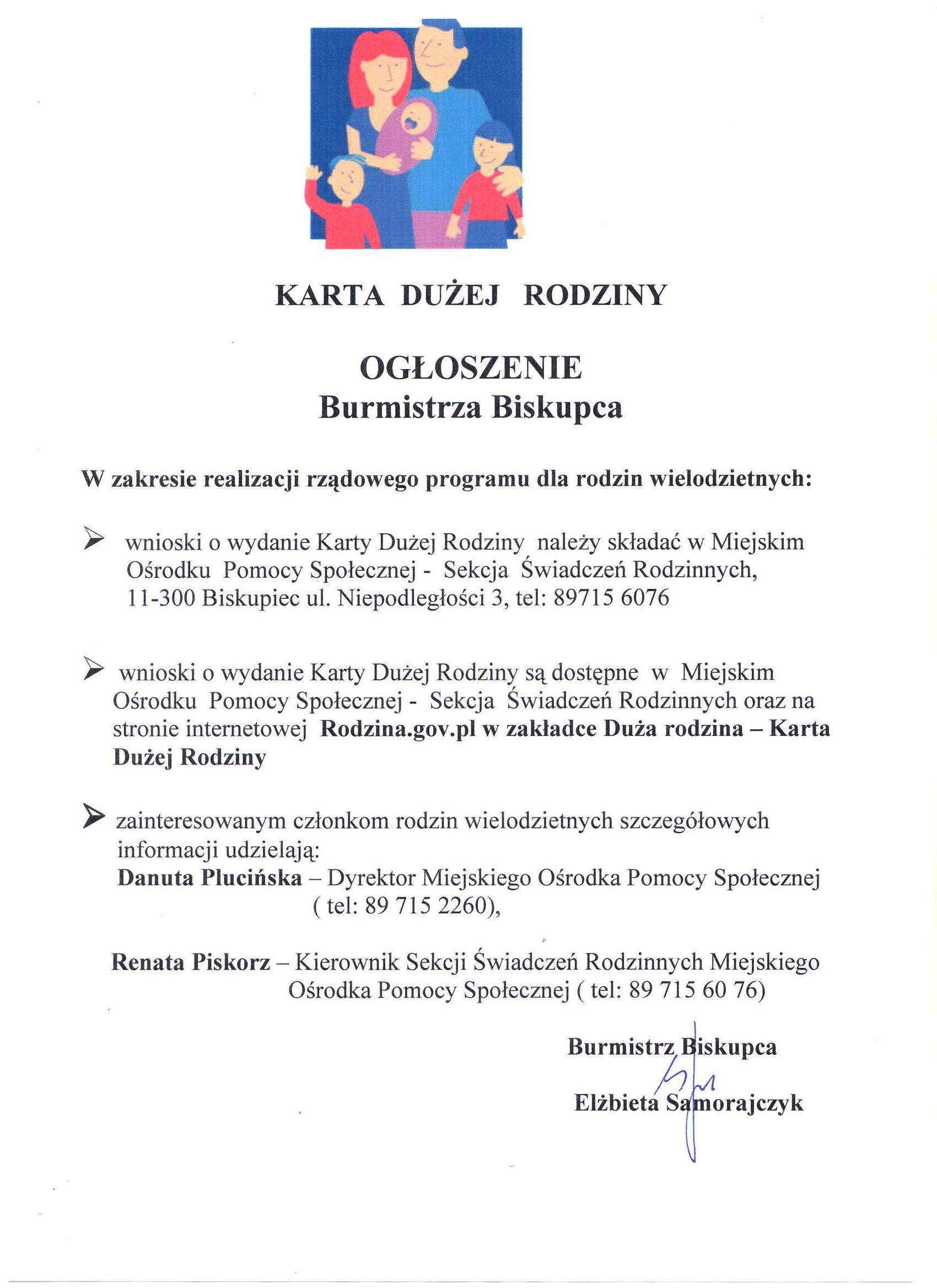Ogłoszenie Burmistrza Biskupca w zakresie realizacji rządowego programu dla rodzin wielodzietnych.
