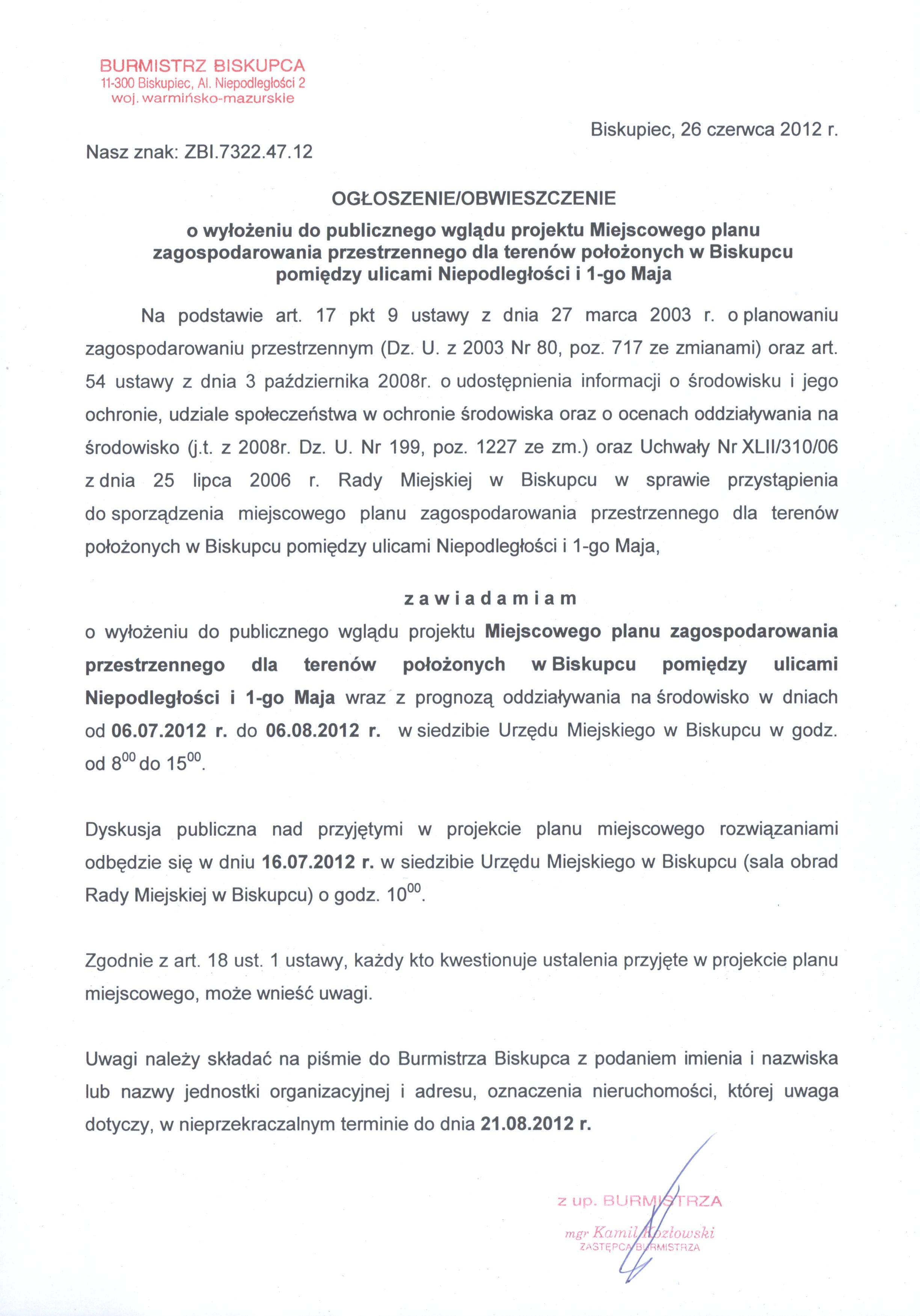 OGŁOSZENIE/OBWIESZCZENIE o wyłożeniu do publicznego wglądu projektu Miejscowego planu zagospodarowania przestrzennego dla terenów położonych w Biskupcu pomiędzy ulicami Niepodległości i 1-go Maja