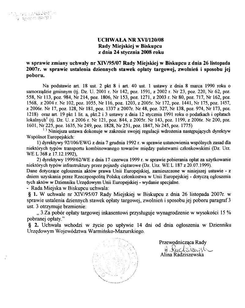 Uchwała Nr XVI/120/08 Rady Miejskiej w Biskupcu z dnia 24 stycznia 2008 roku