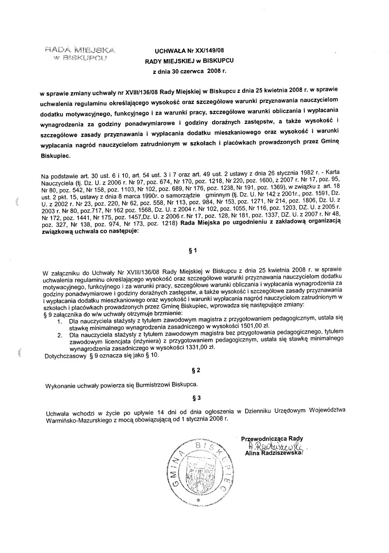 w sprawie zmiany uchwały nr XVIII/136/08 Rady Miejskiej w Biskupcu z dnia 25 kwietnia 2008 r. w sprawie uchwalenia regulaminu określającego wysokość oraz szczegółowe warunki przyznawania nauczycielom dodatku motywacyjnego, funkcyjnego i za warunki pracy, szczegółowe warunki obliczania i wypłacania wynagrodzenia za godziny ponadwymiarowe i godziny doraźnych zastępstw, a także wysokość i szczegółowe zasady przyznawania i wypłacania dodatku mieszkaniowego oraz wysokość i warunki wypłacania nagród nauczycielom zatrudnionym w szkołach i placówkach prowadzonych przez Gminę Biskupiec.