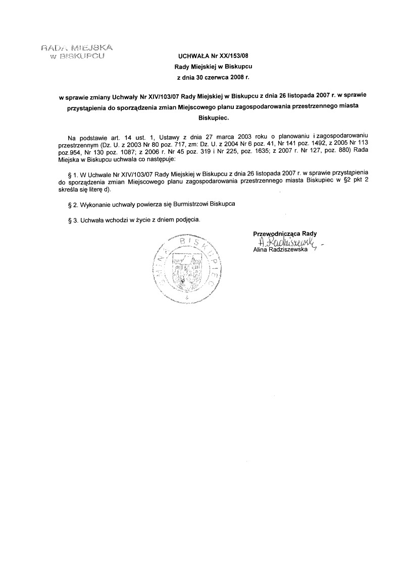 w sprawie zmiany Uchwały Nr XIV/103/07 Rady Miejskiej w Biskupcu z dnia 26 listopada 2007r. w sprawie przystąpienia do sporządzenia zmian Miejscowego planu zagospodarowania przestrzennego miasta Biskupiec.