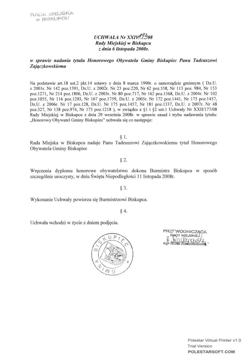 w sprawie nadania tytułu Honorowego Obywatela Gminy Biskupiec Panu Tadeuszowi Zajączkowskiemu