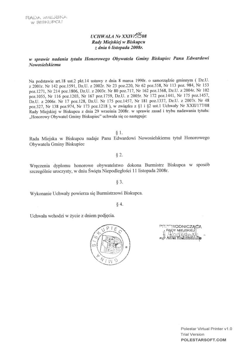 w sprawie nadania tytułu Honorowego Obywatela Gminy Biskupiec Panu Edwardowi Nowosielskiemu