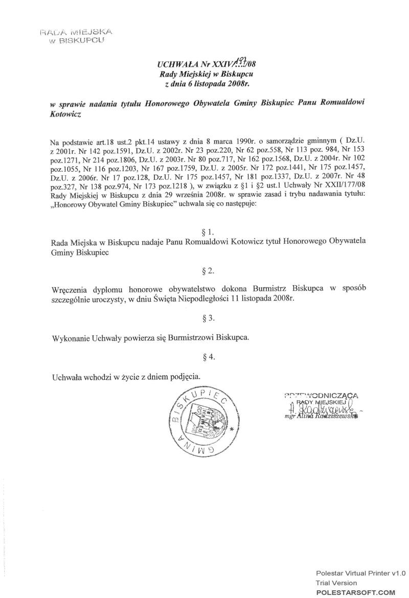w sprawie nadania tytułu Honorowego Obywatela Gminy Biskupiec Panu Romualdowi Kotowicz