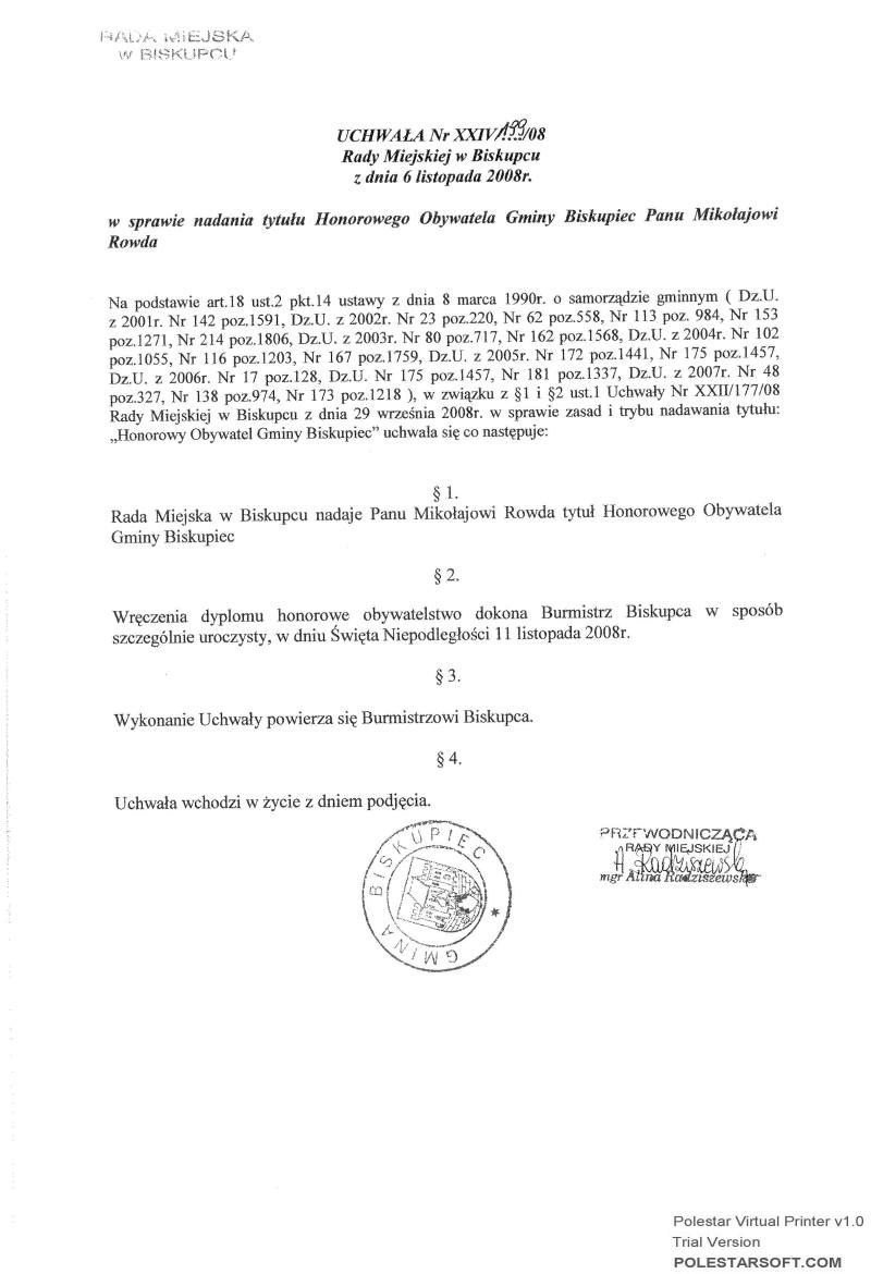 w sprawie nadania tytułu Honorowego Obywatela Gminy Biskupiec Panu Mikołajowi Rowda
