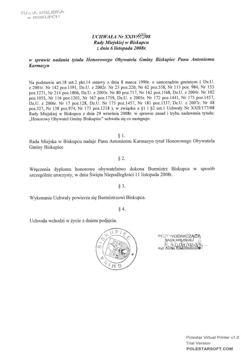 w sprawie nadania tytułu Honorowego Obywatela Gminy Biskupiec Panu Antoniemu Karmazyn