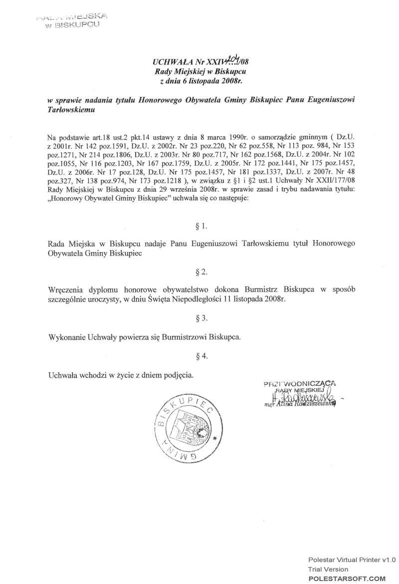 w sprawie nadania tytułu Honorowego Obywatela Gminy Biskupiec Panu Eugeniuszowi Tarłowskiemu