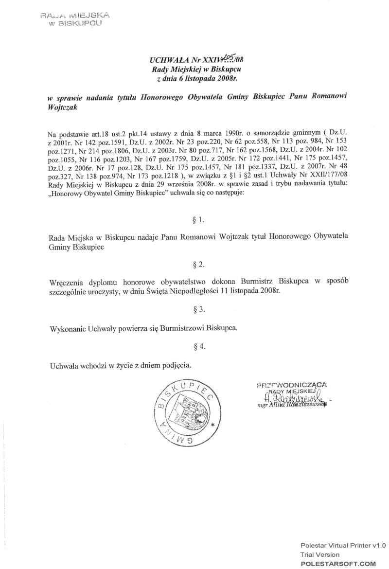 w sprawie nadania tytułu Honorowego Obywatela Gminy Biskupiec Panu Romanowi Wojtczak