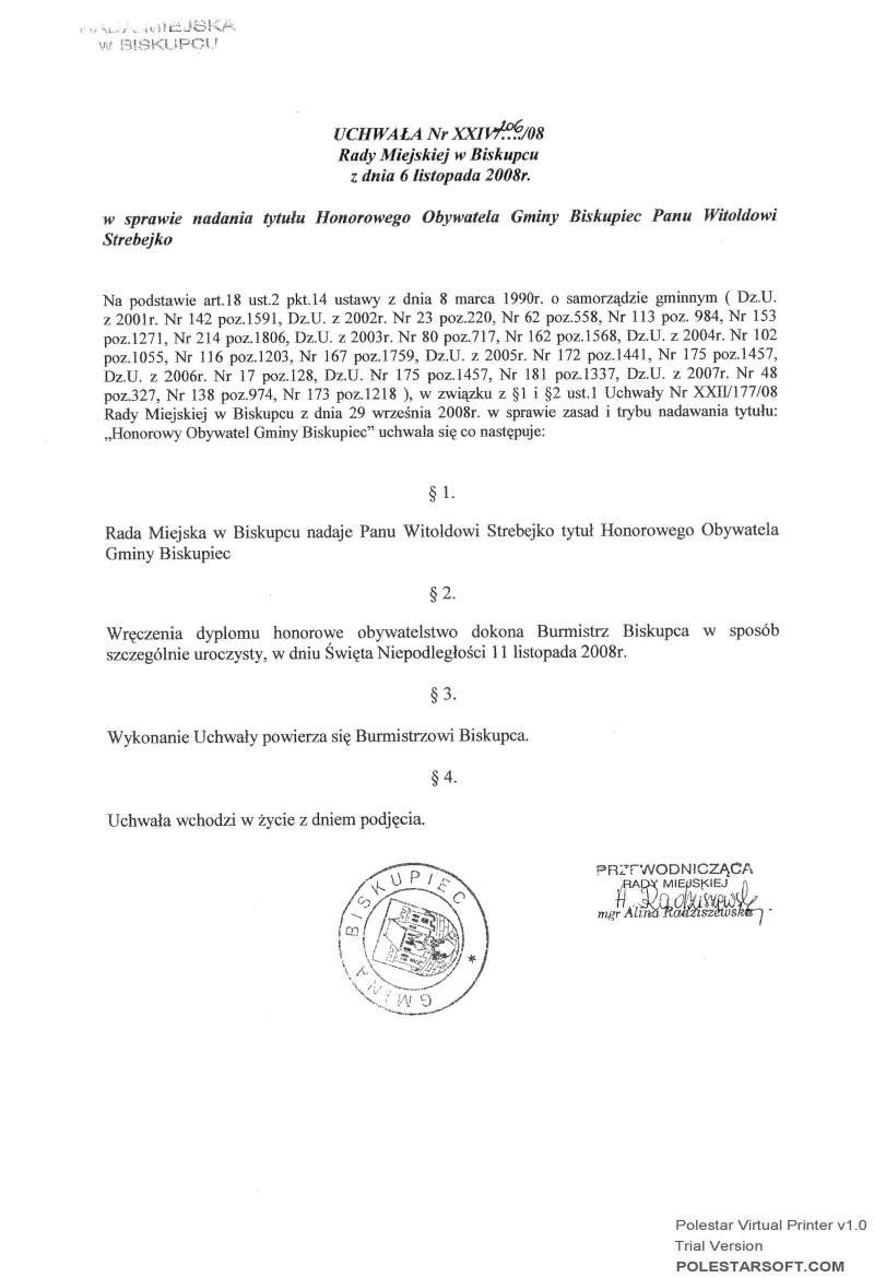 w sprawie nadania tytułu Honorowego Obywatela Gminy Biskupiec Panu Witoldowi Strebejko
