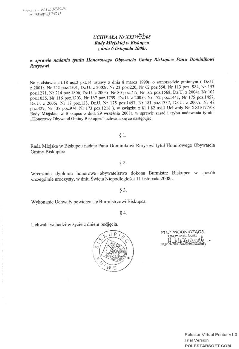 w sprawie nadania tytułu Honorowego Obywatela Gminy Biskupiec Panu Dominikowi Rurysowi