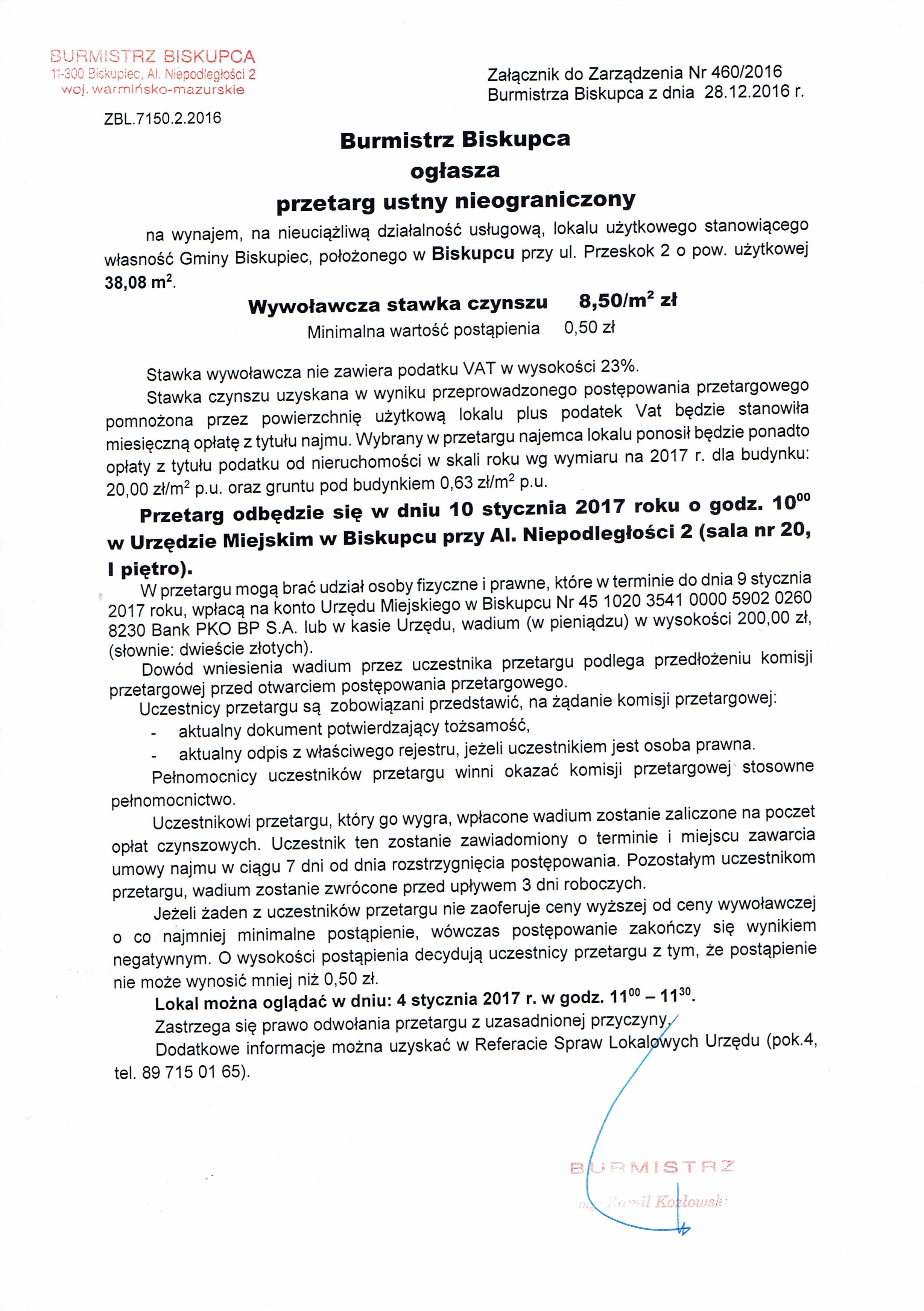 na wynajem, na nieuciążliwą działalność usługową, lokalu użytkowego stanowiącego własność Gminy Biskupiec, położonego przy ul. Przeskok 2 o pow. użytkowej 38,08 m2