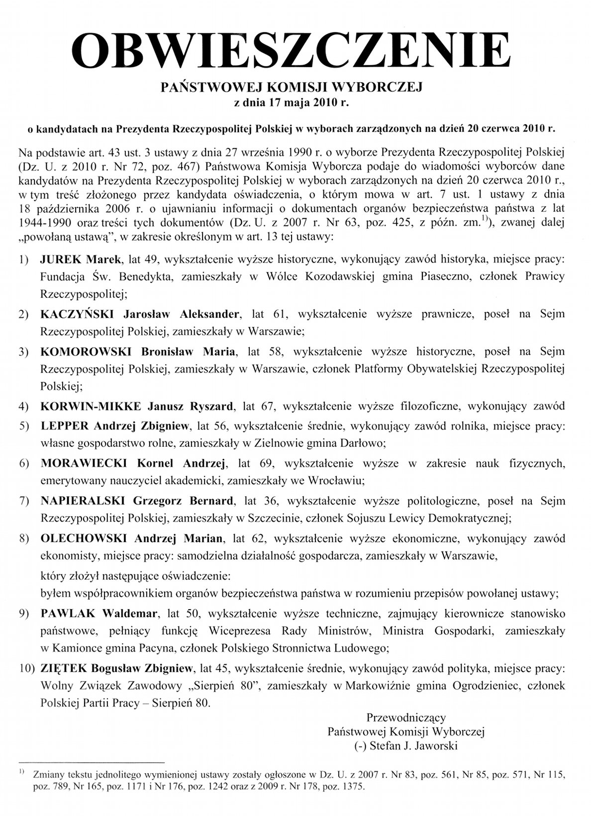 o kandydatach na Prezydenta Rzeczypospolitej Polskiej w wyborach zarządzonych na dzień 20 czerwca 2010 r.