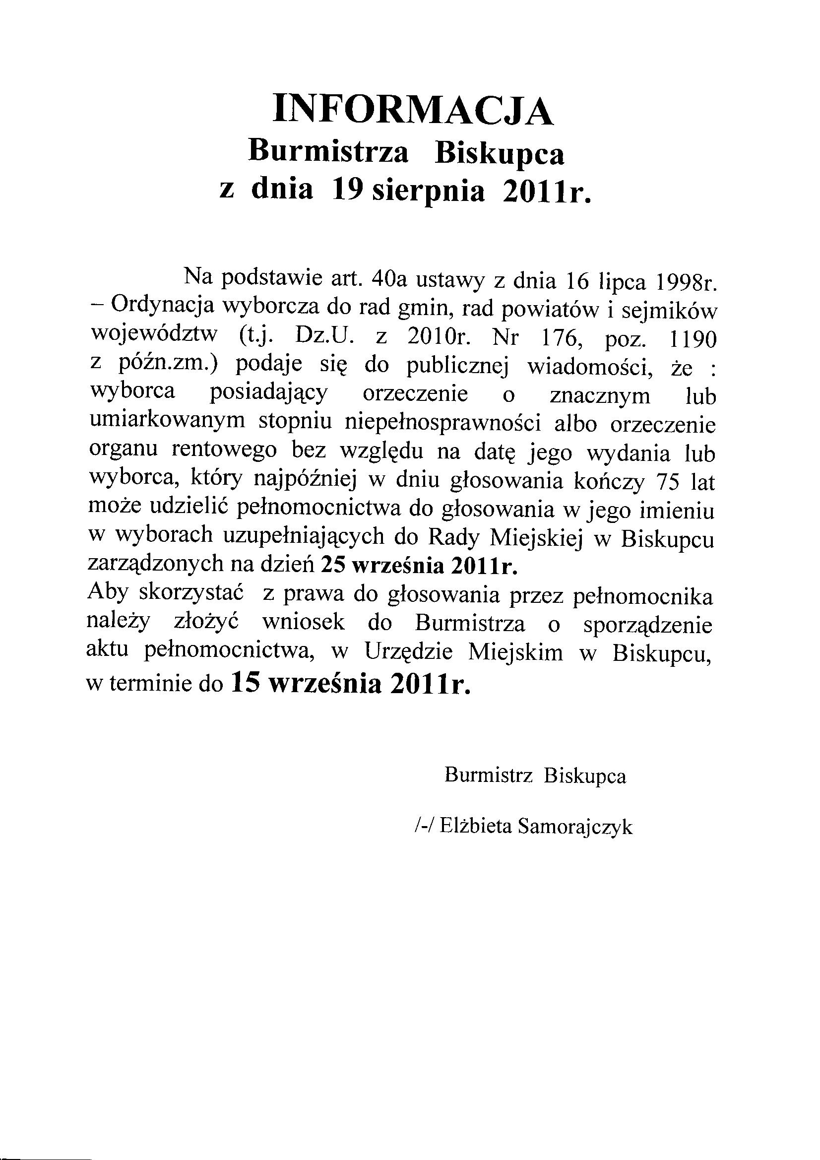 Informacja Burmistrza Biskupca z dnia 19 sierpnia 2011 r.