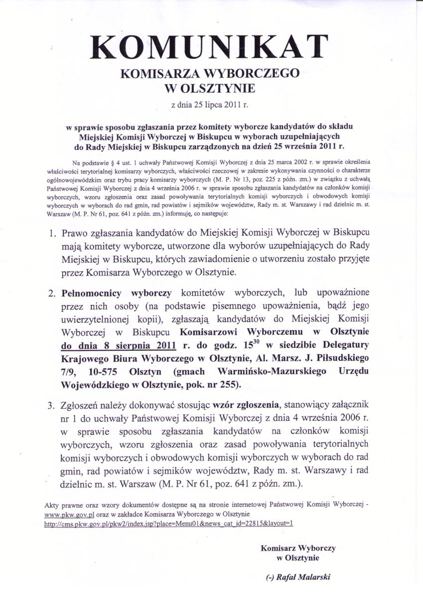 Komunikat Komisarza Wyborczego w Olsztynie z dnia 25 lipca 2011