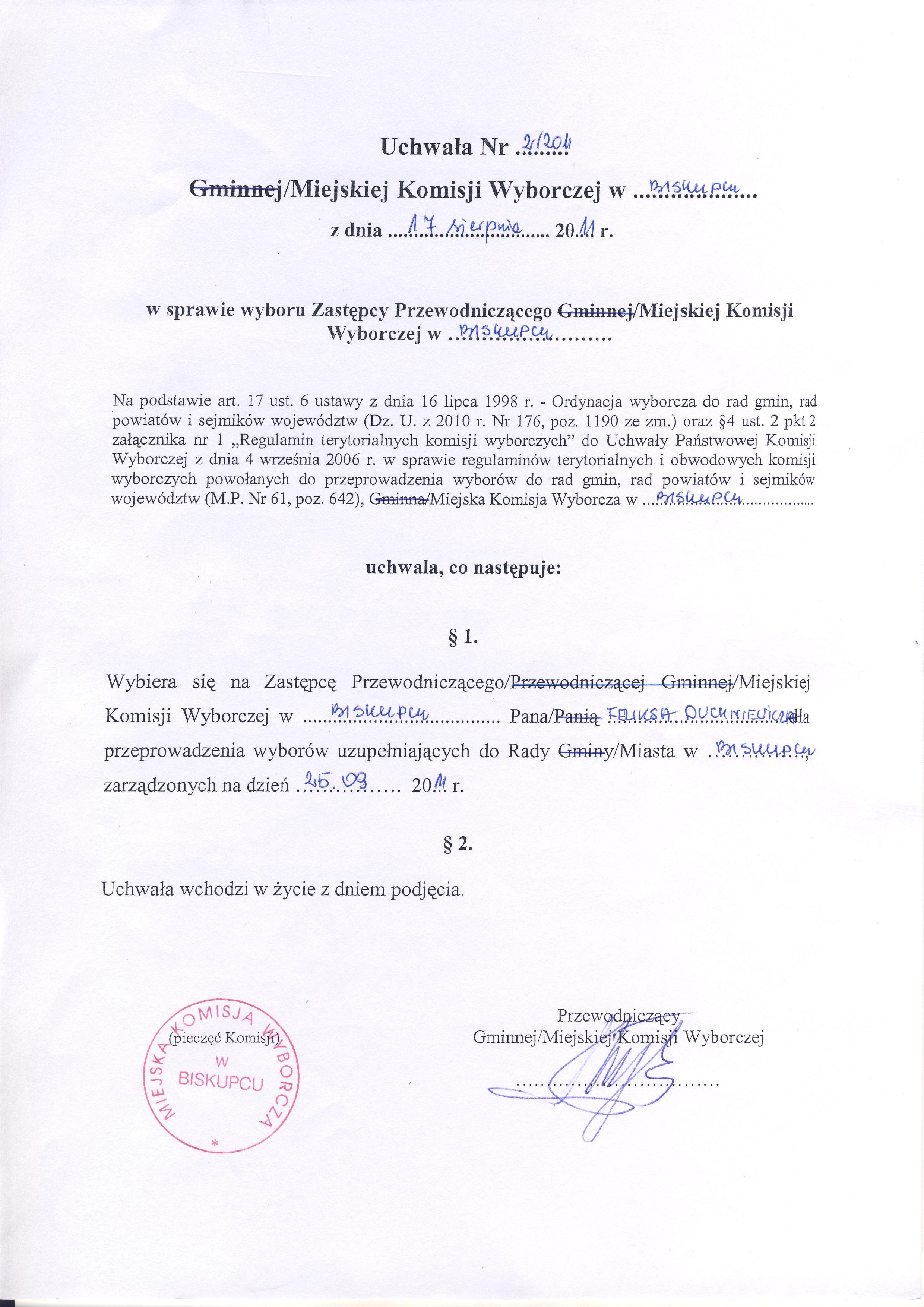 Uchwała Nr 2/2011 Miejskiej Komisji Wyborczej w Biskupcu z dnia 17 sierpnia 2011 roku w sprawie wyboru Zastępcy Przewodniczącego Miejskiej Komisji Wyborczej w Biskupcu.