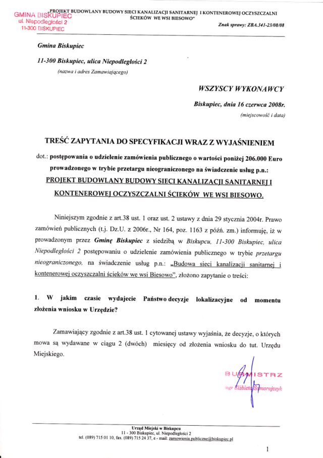 Dotyczy ogłoszenia o wszczęciu postępowania o udzielenie zamówienia publicznego na świadczenie usług p.n.: PROJEKT BUDOWLANY BUDOWY SIECI KANALIZACJI SANITARNEJ I KONTENEROWEJ OCZYSZCZALNI ŚCIEKÓW WE WSI BIESOWO