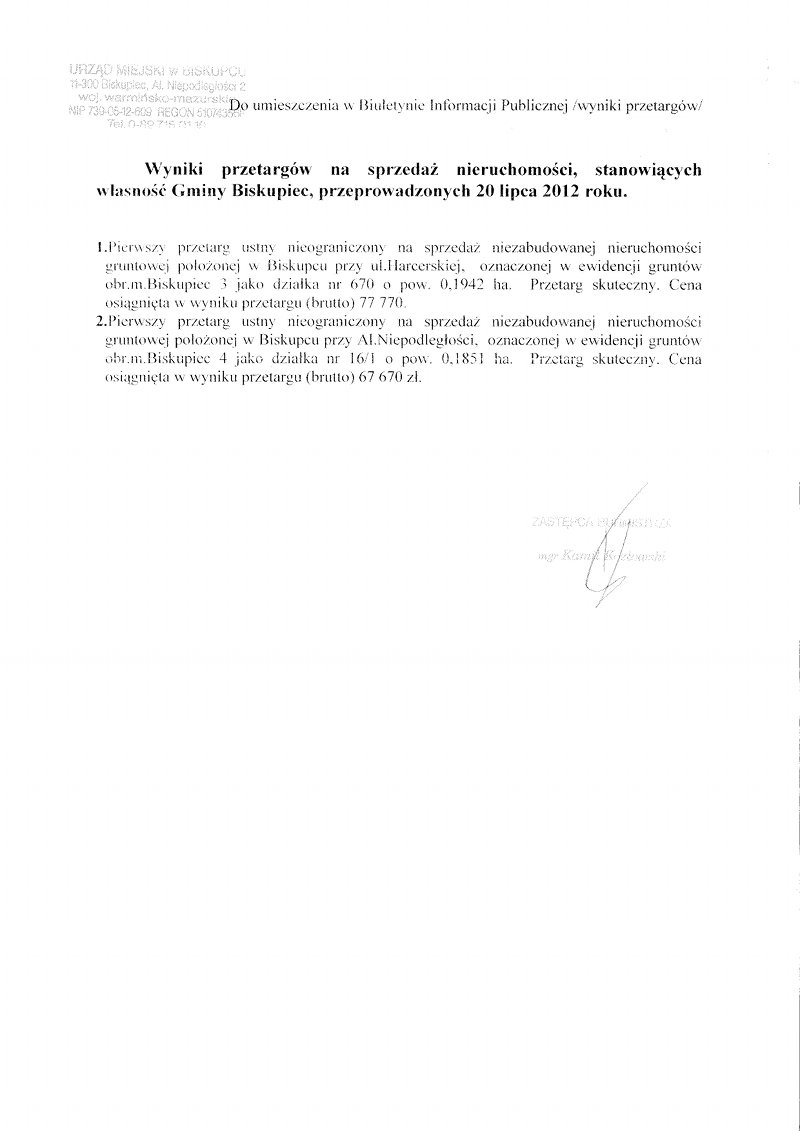Wynik przetargów na sprzedaż nieruchomości, stanowiącej własność Gminy Biskupiec, przeprowadzonych 20 lipca 2012 roku