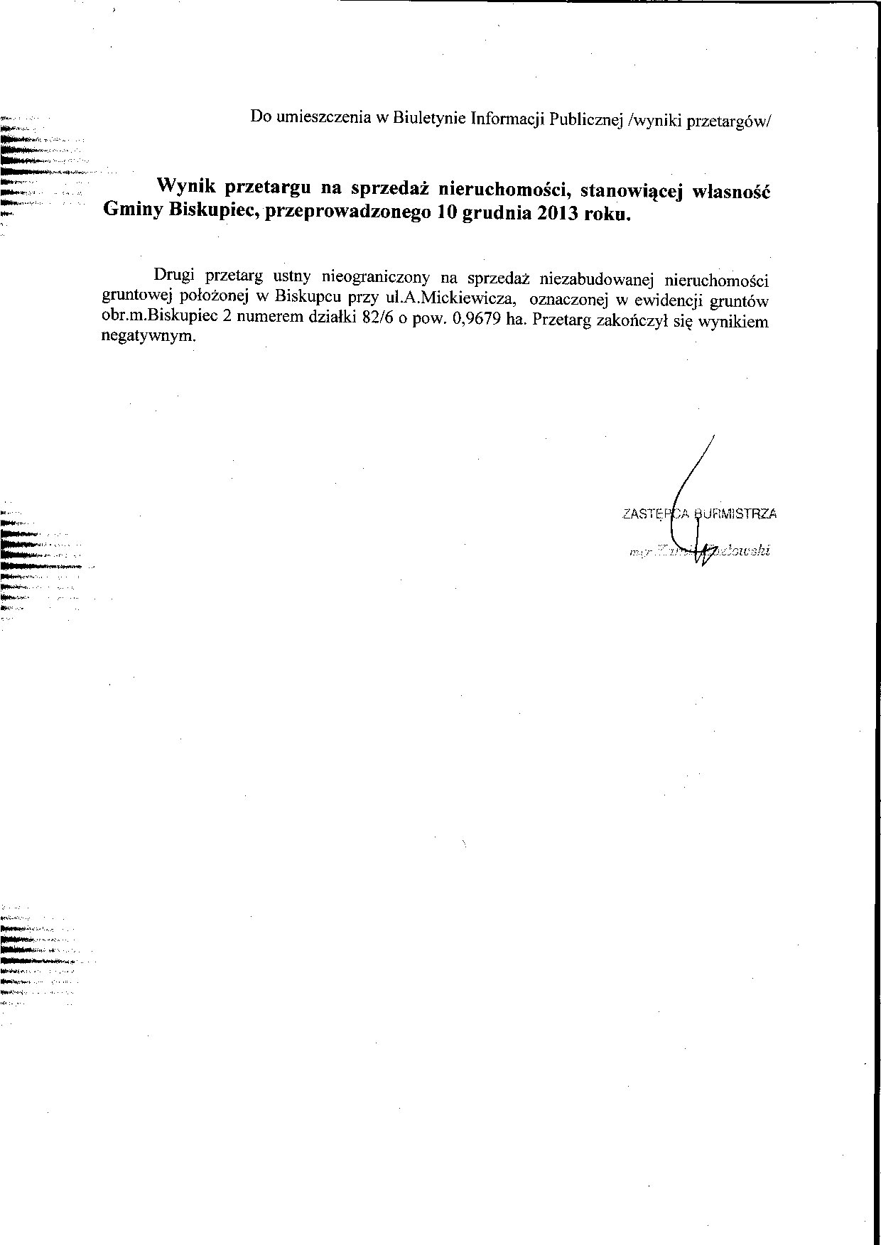 Wynik przetargu na sprzedaż nieruchomości, przeprowadzonego 10 grudnia 2013 roku.