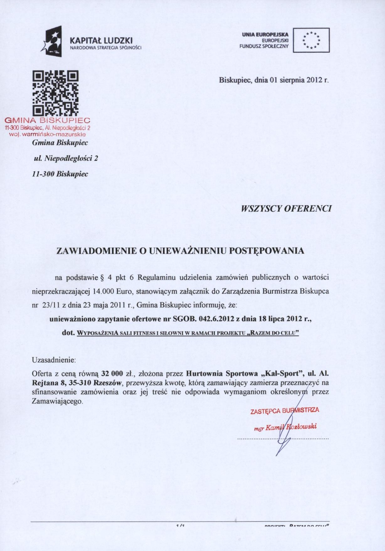Zawiadomienie o uniewazninieniu postępowania